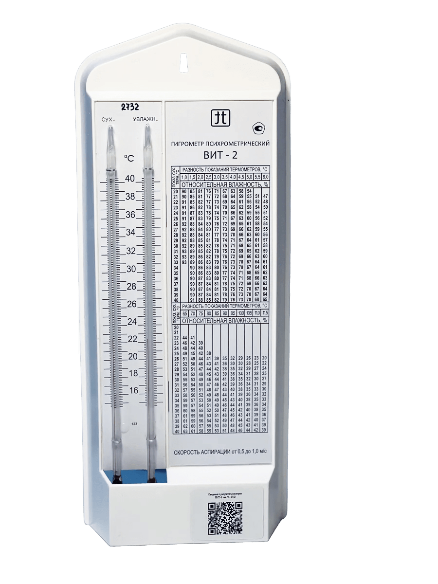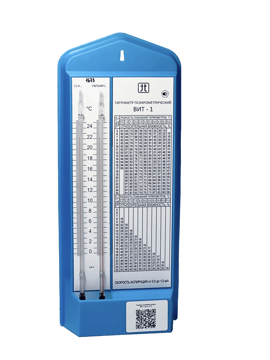 Гигрометры психрометрические. Состоят из пластмассового основания, на котором закреплены температурная шкала с двумя капиллярами, резервуар одного из которых увлажняется фитилем из ткани, опущенным в питатель с водой, и таблица для определения относительной влажности воздуха по разнице показаний «сухого» и «увлажненного». Питатель закреплен с внутренней стороны основания. Шкальная пластина и таблица – полистирол.